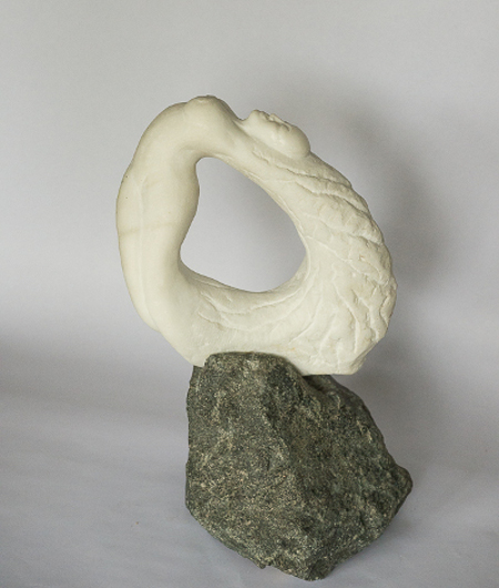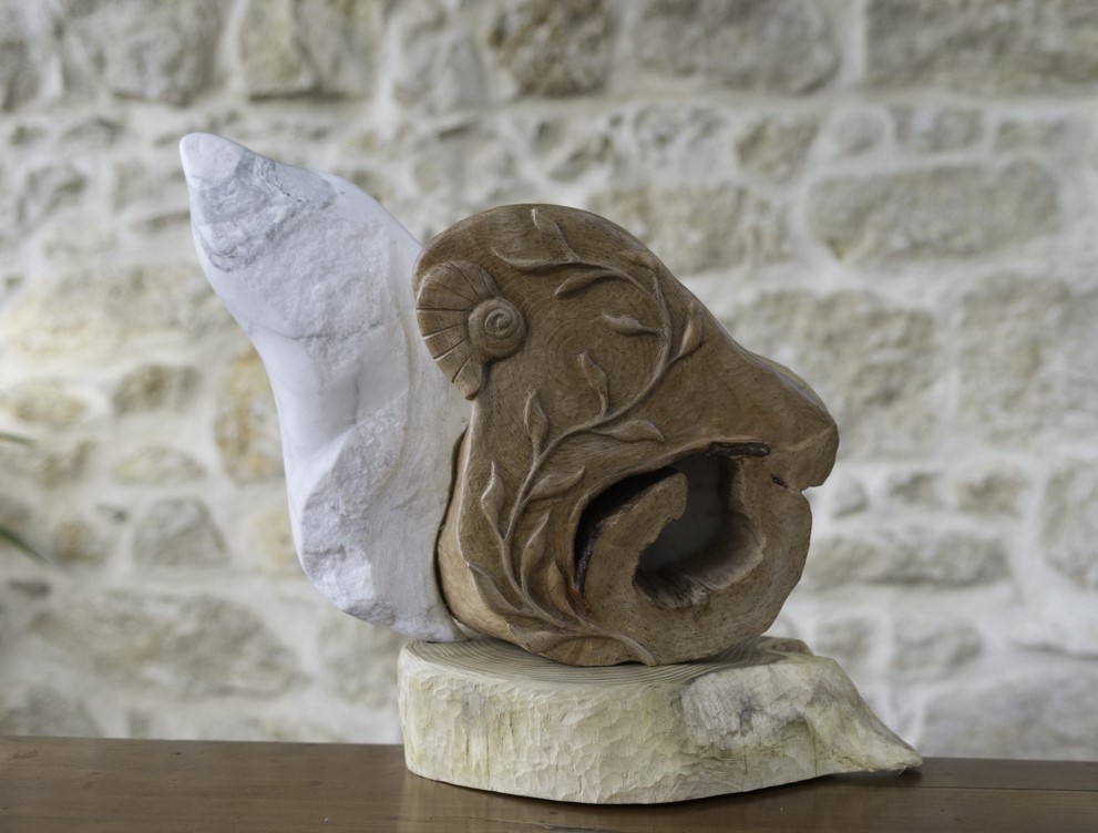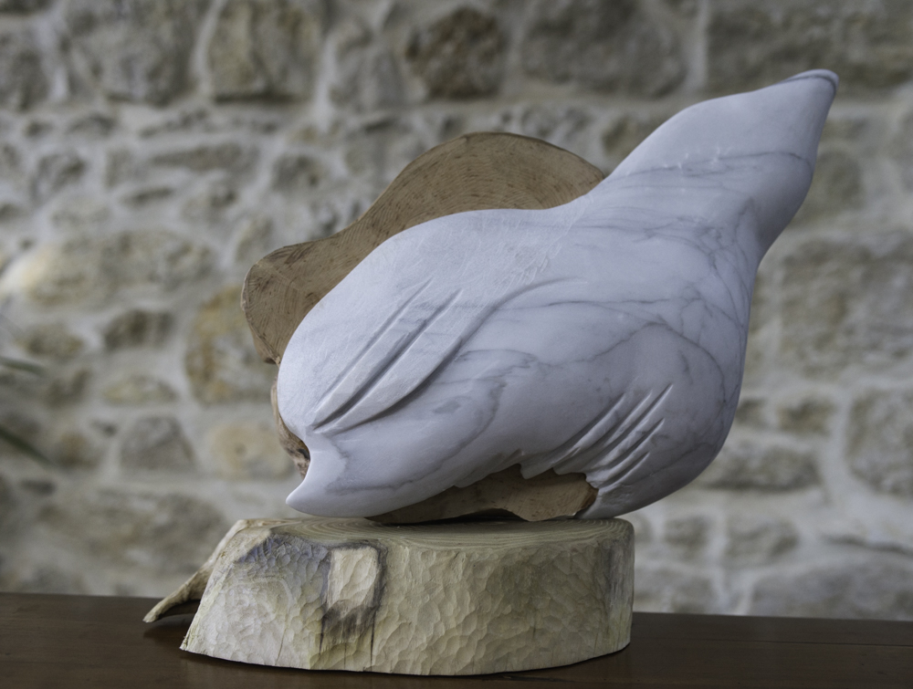 duo organique alliantle bois sculpté par Jean Bizouarneetle marbre de Carrare sculptépar Laurence Mulon